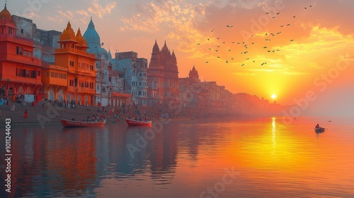 Naklejka premium Golden Sunset Reflecting on the Majestic Temples and Ghats of Varanasi