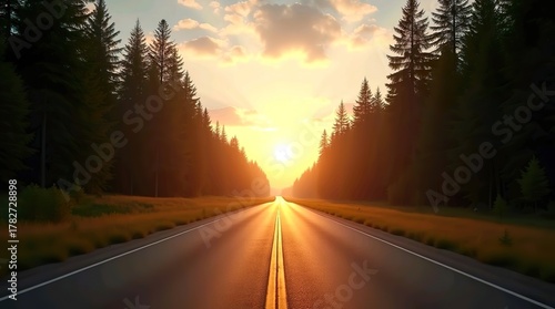 Fototapeta premium Golden Sunset Road Through Pine Forest
