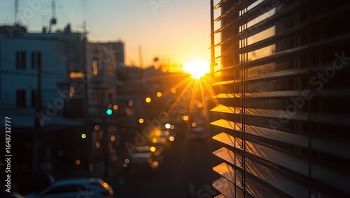 Obraz premium Golden sunset seen through blinds, city in soft focus