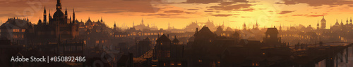 © evening_tao, Fototapeta premium Golden Sunset Silhouette Over Historic Cityscape