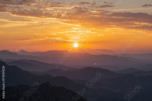 Fototapeta premium Golden sunset sky above shadowy peaks