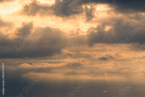 Obraz premium Golden Sunset Sky with Sun Rays Breaking Through Clouds