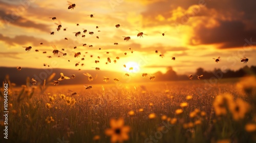 Obraz premium Golden Sunset Swarm: Bees in Flight - Bees fly at sunset, symbolizing nature,...