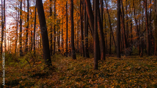 Obraz premium Golden Sunset Through Autumn Forest Trees