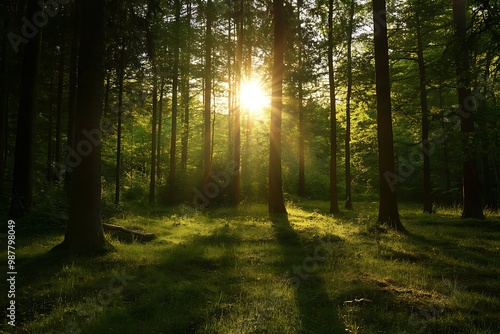 © atar, Fototapeta premium Golden Sunset Through Forest Trees