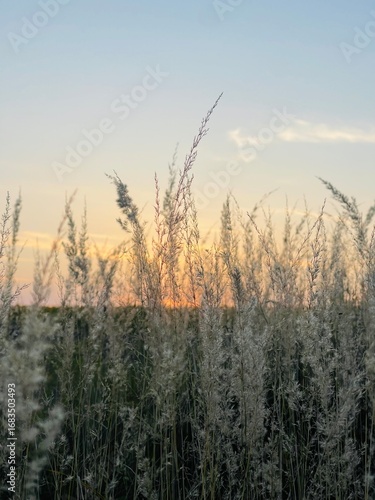© Olesia, Fototapeta premium Golden sunset through tall grass. Warm, peaceful rural evening with soft light.