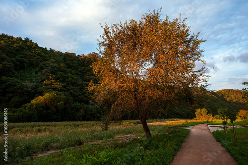 Naklejka premium Golden Sunset Tree Along a Peaceful Walking Path in Korea