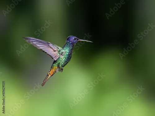 Fototapeta premium Golden-tailed Sapphire Hummingbird in flight against green background