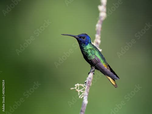 © FotoRequest, Fototapeta premium Golden-tailed Sapphire Hummingbird on a stick against green background