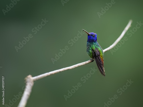 © FotoRequest, Fototapeta premium Golden-tailed Sapphire Hummingbird on a stick against green background