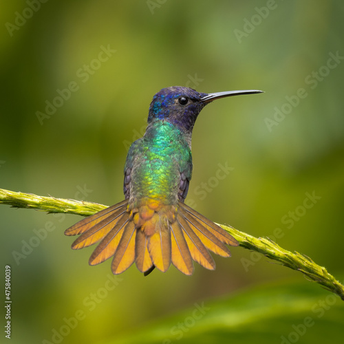 © Wim, Fototapeta premium Golden-tailed Sapphire hummingbird perched on a branch with showing tail feathers