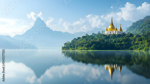© Agusti, Naklejka premium Golden Temple Reflecting on Calm Lake in Myanmar Mountains