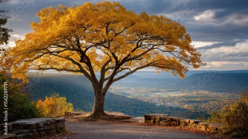 Naklejka premium Golden tree atop cliff, overlooks valley in autumn sunlight