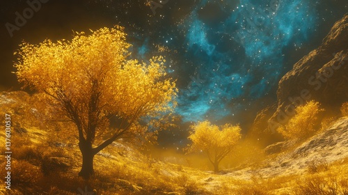 © Lycee, Obraz premium Golden trees stand on a hill beneath a starry night sky