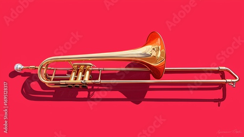© ghulamsakhi, Obraz premium golden trombone jazz musical instrument light red background
