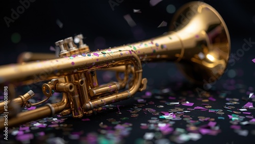 © Aleks, Obraz premium Golden Trumpet with Confetti on Black Background.