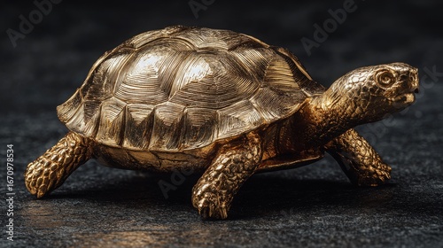 © JovialFox, Naklejka premium Golden turtle statuette, shiny carapace, on a textured surface. A symbol of longevity and slow progress, against a dark backdrop.