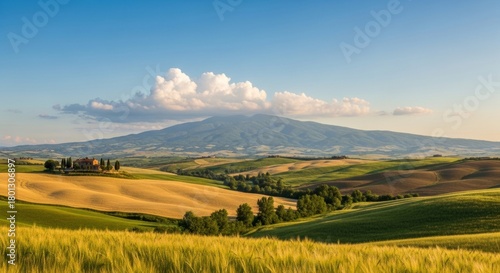 Naklejka premium Golden Tuscan Hills Under a Cloudy Sky, Tuscany, Italy, Landscape