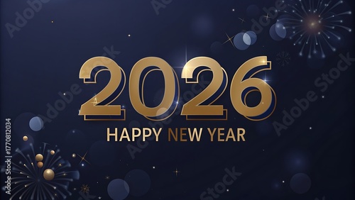 © Imdad, Naklejka premium Golden twenty twenty six new year greeting with fireworks on a dark blue background