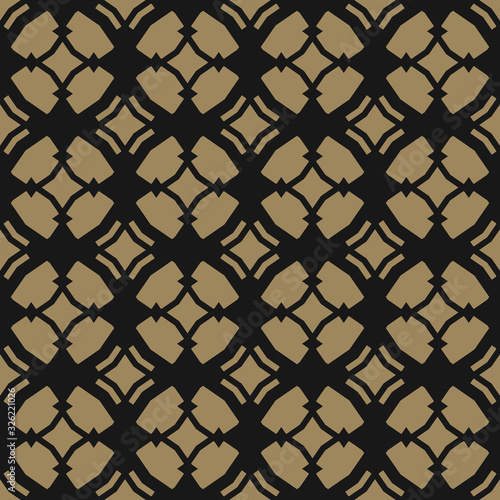 © Olgastocker, Naklejka premium Golden vector ornamental seamless pattern in Arabian style. Elegant gold and black texture with carved grid, lattice, mesh, net, repeat geometric tiles. Moroccan style background. Luxury design