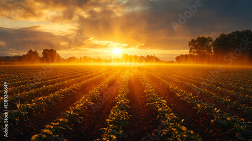 © Bartek, Obraz premium Golden Vegetable Crop Field at Sunset with Irrigation System in Alberta Landscape