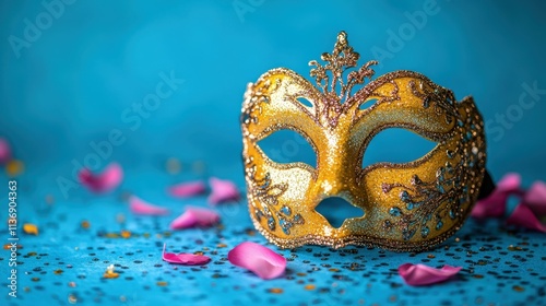 © Premium Illustration, Naklejka premium Golden Venetian mask with intricate filigree design resting on blue surface with pink petals and confetti, perfect for carnival, masquerade parties, festive celebrations, and elegant events backgroun