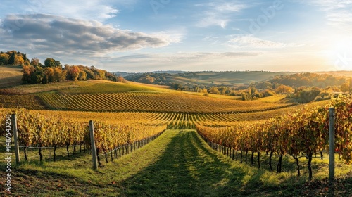 © Adip, Fototapeta premium Golden vineyard landscape under a partly cloudy sky.