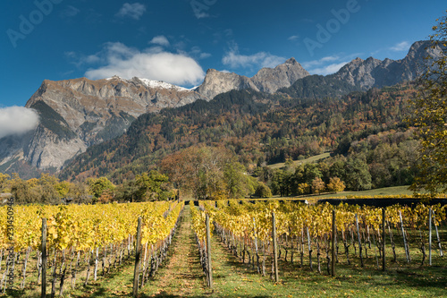 Naklejka premium golden vineyards and grapevines in the mountain landscape of the Maienfeld...