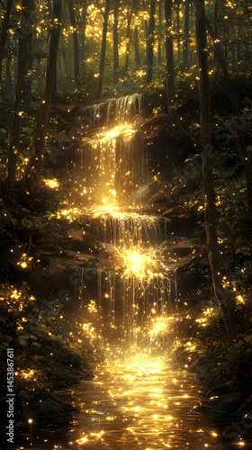 Naklejka premium Golden waterfall cascades through a lush forest its waters shimmering with...