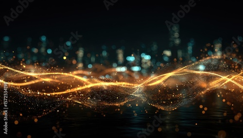 Obraz premium Golden, wavy, particle streaks over a dark city