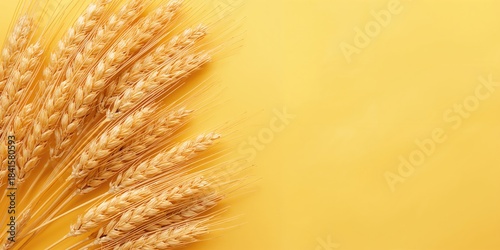 © pngking, Fototapeta premium Golden wheat and rye ears, dry yellow cereals spikelets on yellow background, used for agricultural research, World Food Day