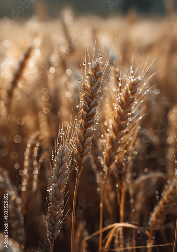 Fototapeta premium Golden wheat ears covered in sparkling morning dew drops shine vibrantly