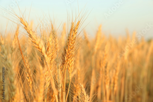 Obraz premium Golden wheat ears growing in field, closeup