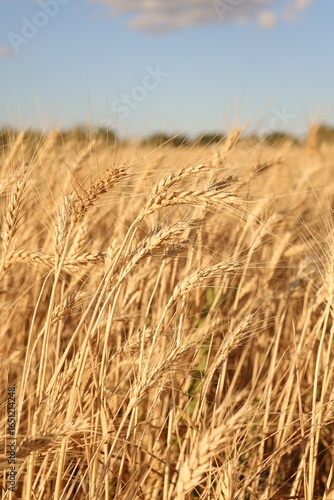 © New Africa, Fototapeta premium Golden wheat ears growing in field, closeup