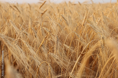 © New Africa, Fototapeta premium Golden wheat ears growing in field, closeup