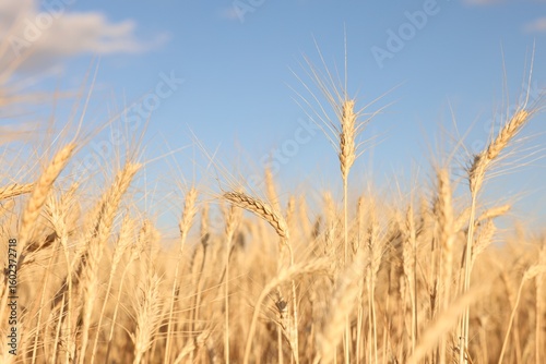 © New Africa, Fototapeta premium Golden wheat ears growing in field under blue sky, closeup