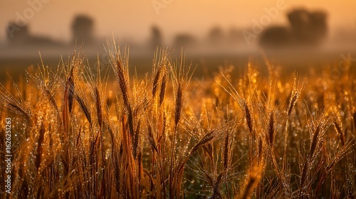 Obraz premium Golden Wheat Field at Sunrise with Dew Drops
