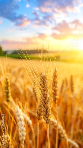 © Tru, Fototapeta premium Golden Wheat Field at Sunset - A Bountiful Harvest Landscape.