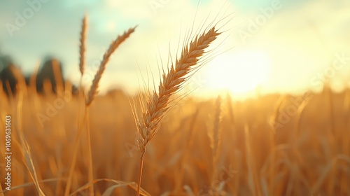 Fototapeta premium Golden Wheat Field at Sunset Closeup of Ear of Grain