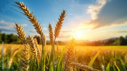 © Ika, Obraz premium Golden wheat field at sunset, rural landscape