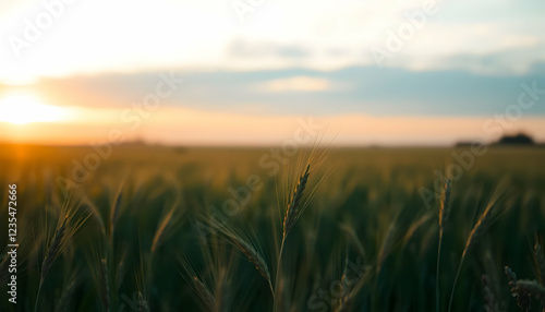 Obraz premium Golden wheat field at sunset, warm glow, rural landscape, hazy sky, low...