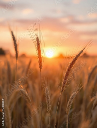 Obraz premium Golden wheat field at sunset with sunlit horizon and soft clouds