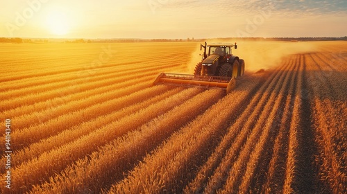 © Sunshine, Fototapeta premium Golden Wheat Field at Sunset with Tractor Harvesting Crops in Rural Countryside