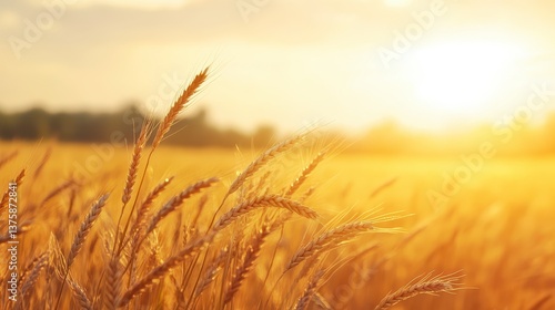 Fototapeta premium Golden Wheat Field: Golden wheat field bathed in warm sunlight, creating a...