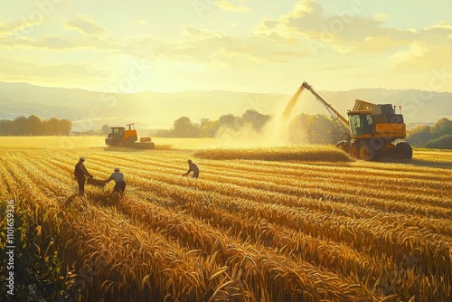 © Murda, Fototapeta premium Golden wheat field, harvesting, combines, workers.