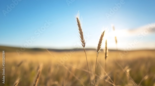 Fototapeta premium Golden wheat field illuminated by sunlight under a clear blue sky showing...