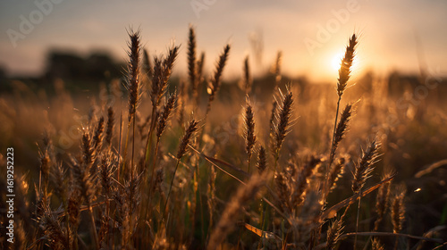 © Jhati, Fototapeta premium Golden wheat field illuminated by the setting sun in a serene landscape view