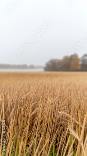 © Valeriia, Obraz premium Golden Wheat Field in Autumn Mist: A Serene Rural Landscape Capturing the Tranquil Beauty of Harvest Season and Earthy Tones