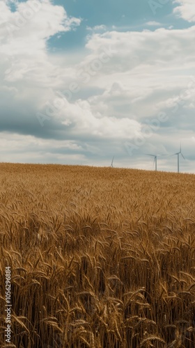 Fototapeta premium Golden wheat field meeting cloudy sky with wind turbines generating clean energy