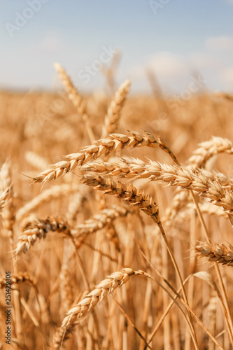 Fototapeta premium Golden wheat field on blue sky background